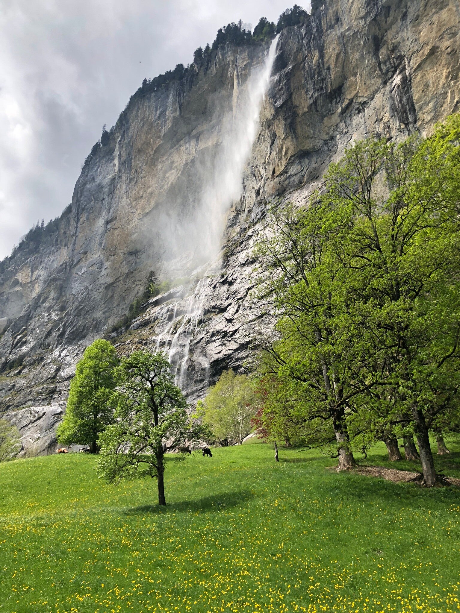 The most iconic of the waterfalls is Staubbach Falls, plunging nearly 300 meters right next to the village. You can even walk behind the spray on a short uphill path (don’t worry, it’s a quick stroll—not a hike).