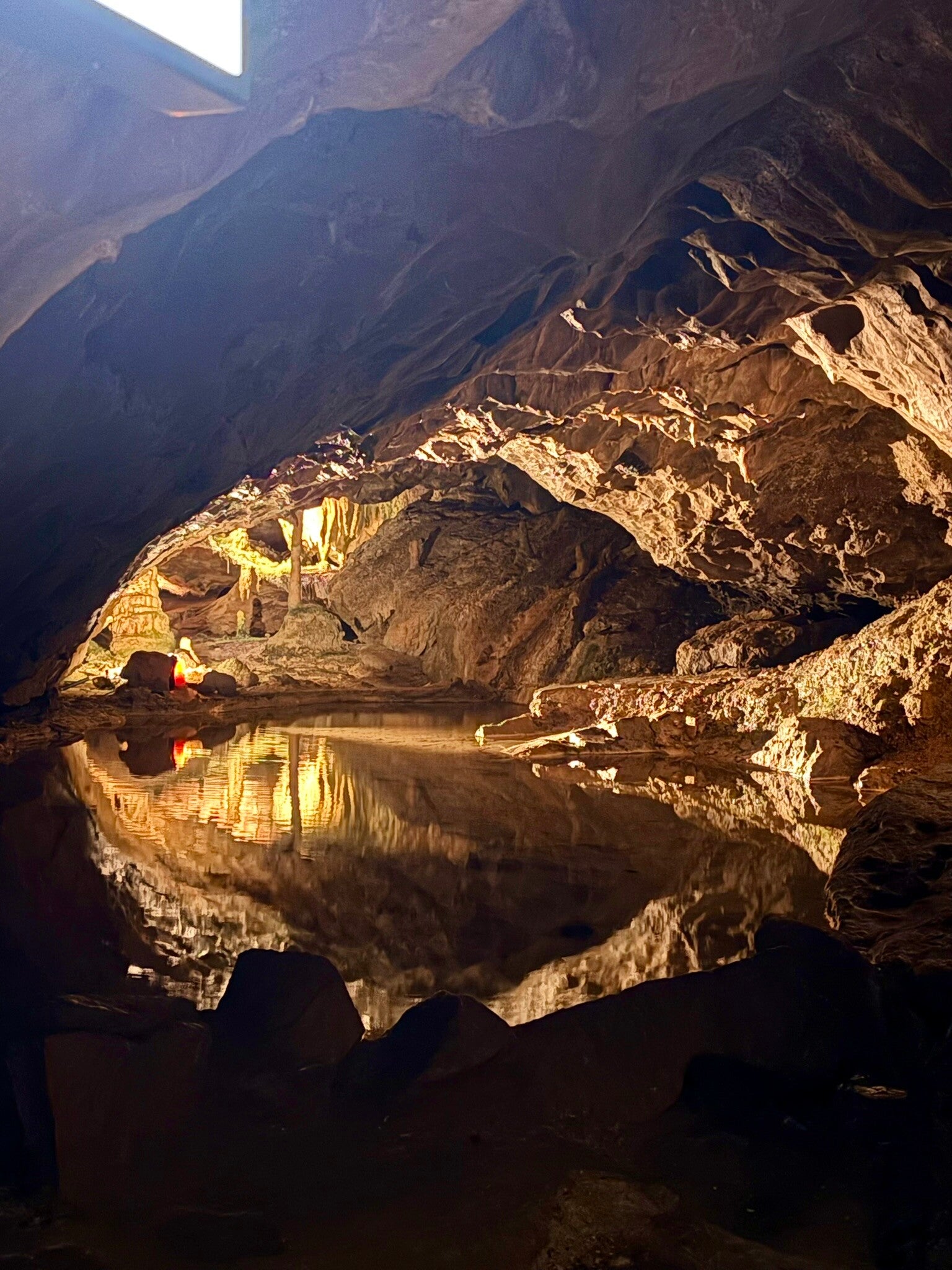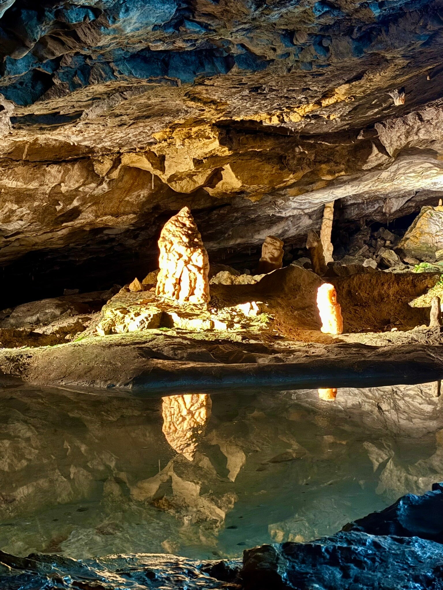 - Multiple underground bodies of water, ranging from small, reflective pools to roaring waterfalls, all fully inside the cave.