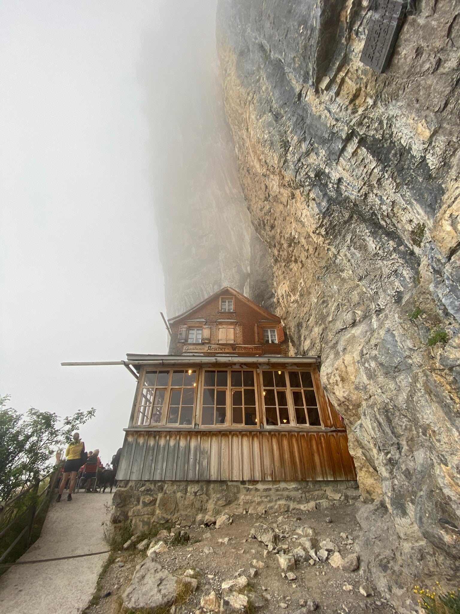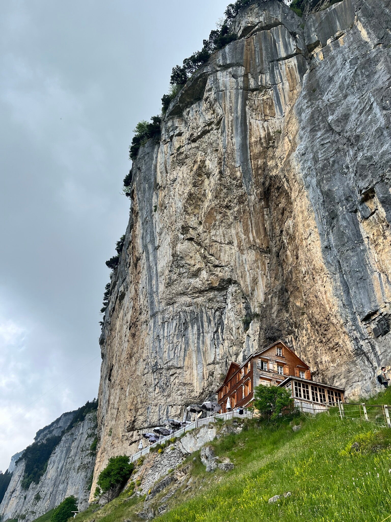 Continuing the mountain theme, here's another view for the postcards. Tucked dramatically into the side of a sheer cliff in the Appenzell Alps, Aescher Guesthouse is one of Switzerland’s most unique and photogenic mountain restaurants.
