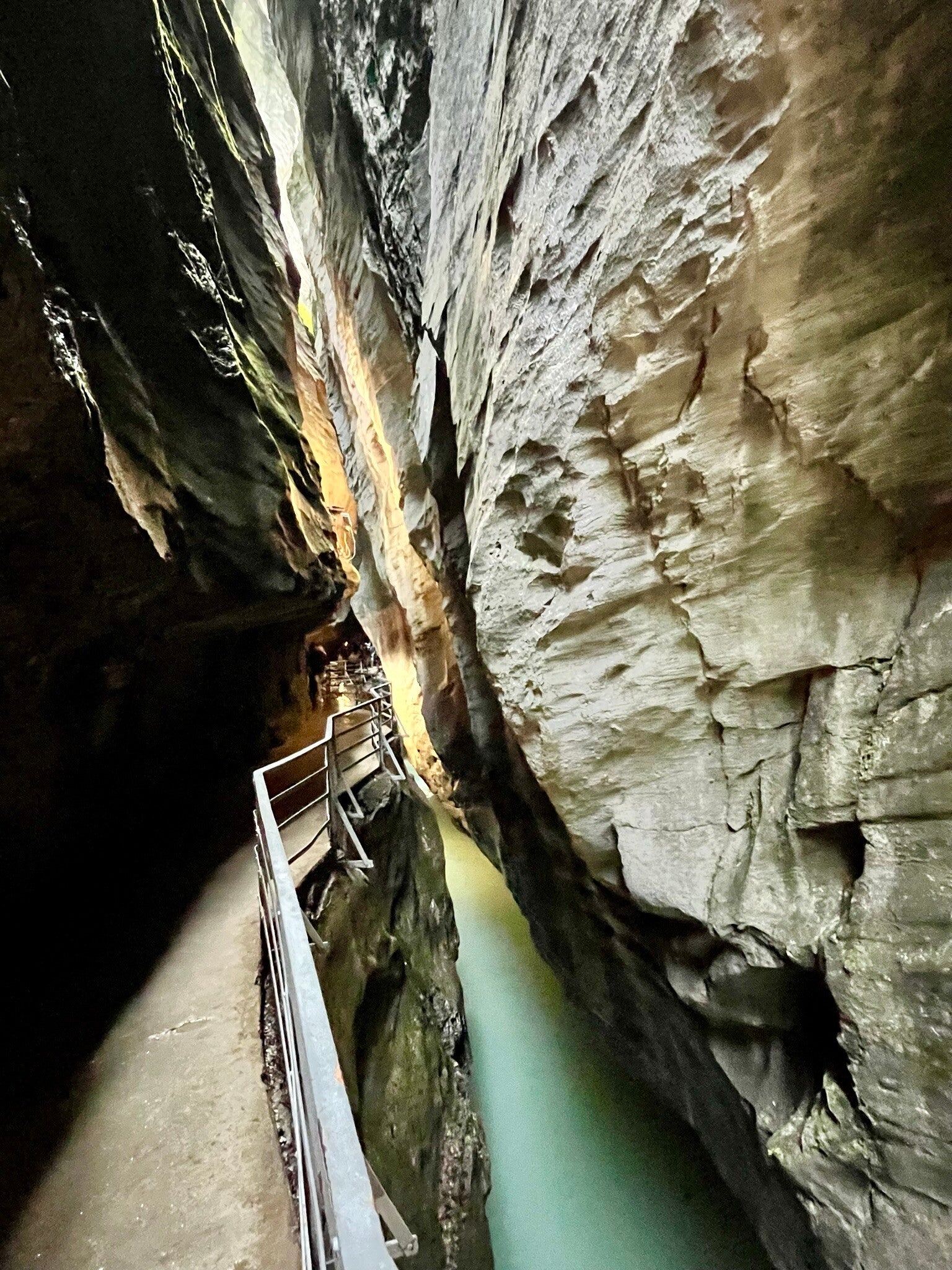This narrow limestone canyon has been carved over thousands of years by the turquoise waters of the Aare River, slicing through vertical cliffs that rise up to 50 meters high.