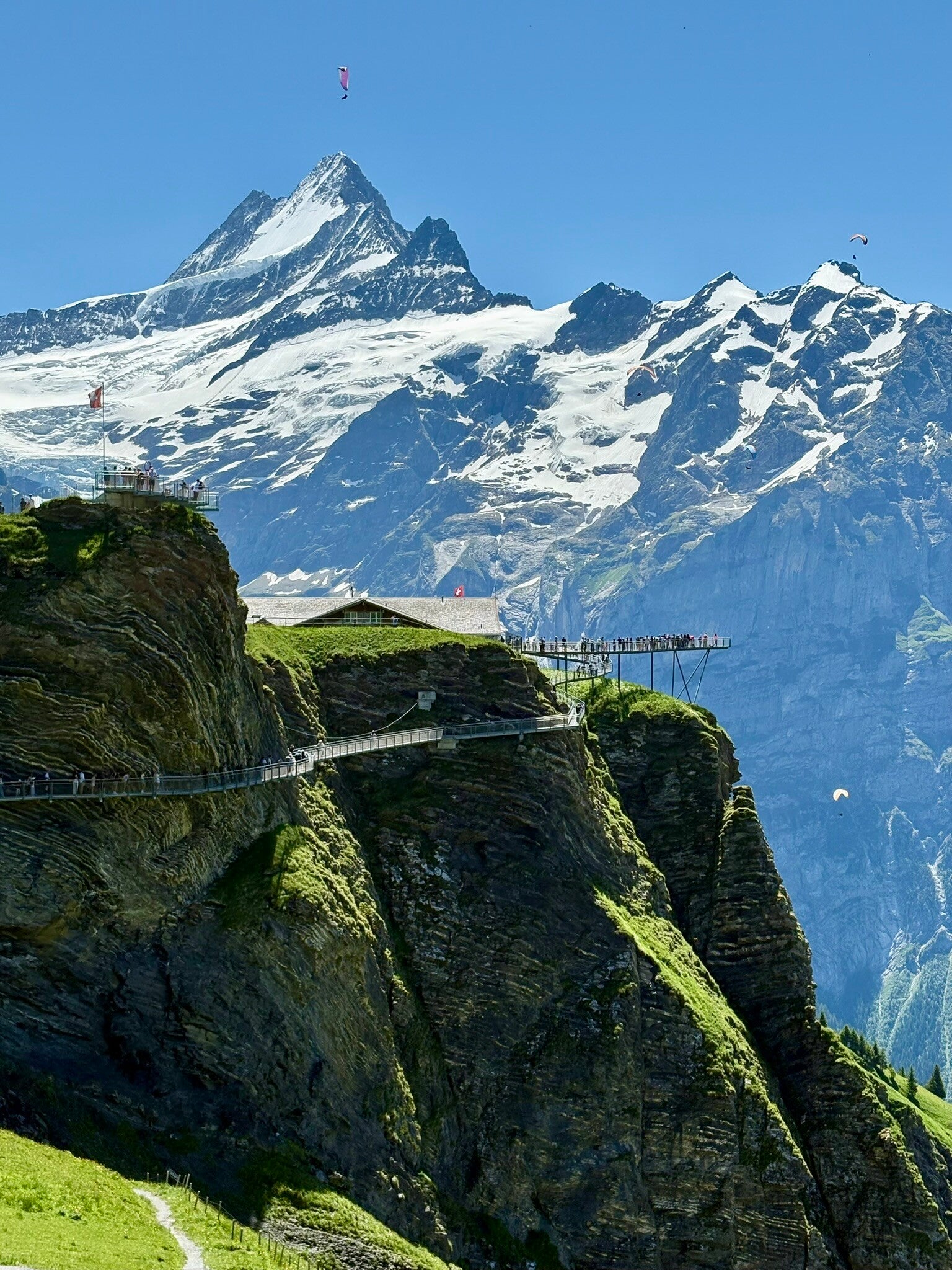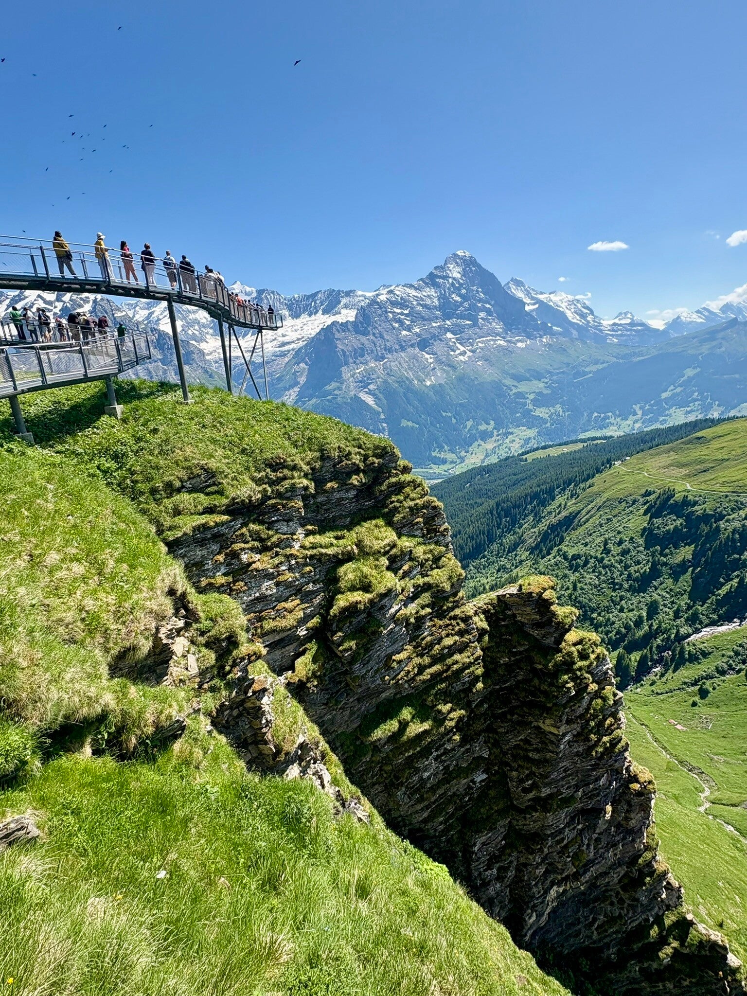 Perched at 2,100 meters above sea level, this narrow steel walkway and glass-floored viewing platform extend dramatically over the edge, offering panoramic views of the Bernese Alps, including the legendary Eiger peak.