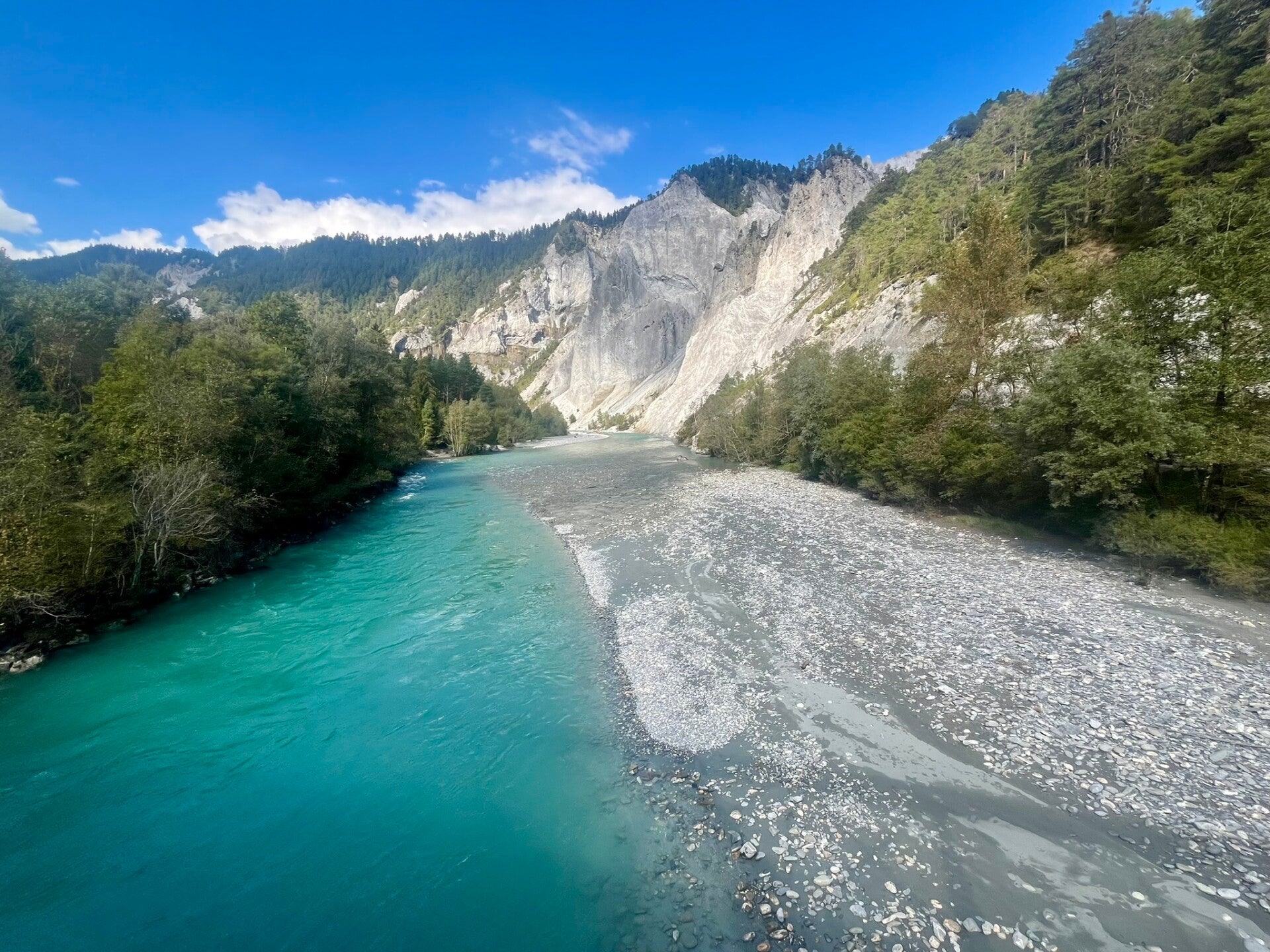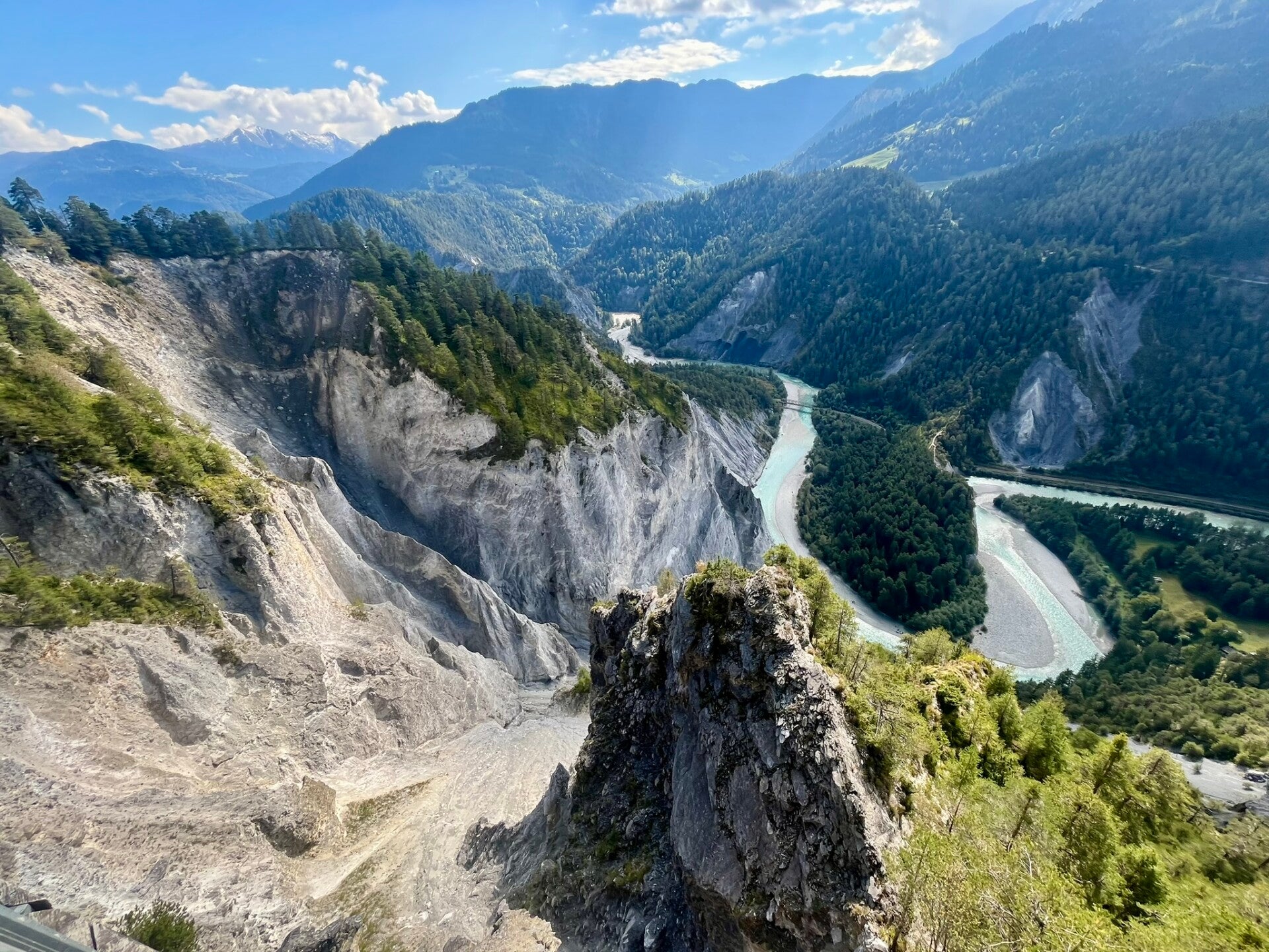 Next major viewpoint is halfway through hike - Ilβ―Spir, an observation platform offering a 180° view over the Rhine gorge, framed by rock cliffs and alpine forest. The gorge itslef was formed over 10,000 years ago by a massive rockslide in the Flims region, and today it's a hotspot for spectacular views and activities like rafting and kayaking.