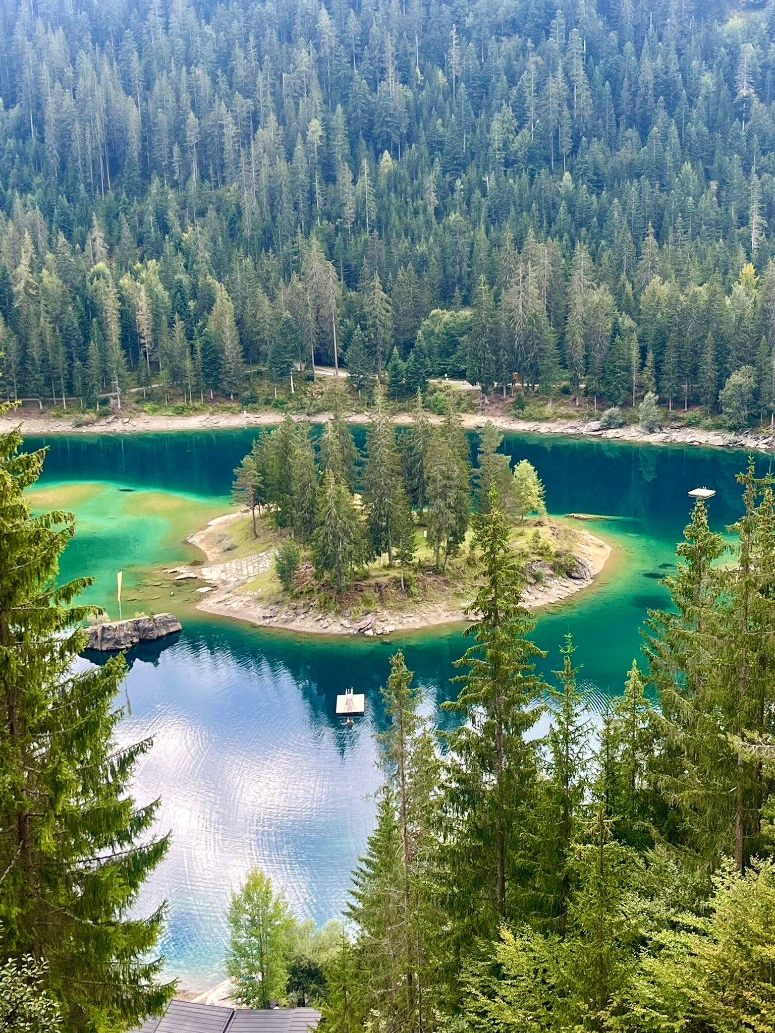 Almost right at the start of the trail, you’ll be greeted by Caumasee’s incredibly blue—almost tropical-looking—waters. The striking color comes from glacial meltwater mixed with mineral-rich underground springs. Adding to the charm, Caumasee features a small natural island in the middle, making the scene even more unique.